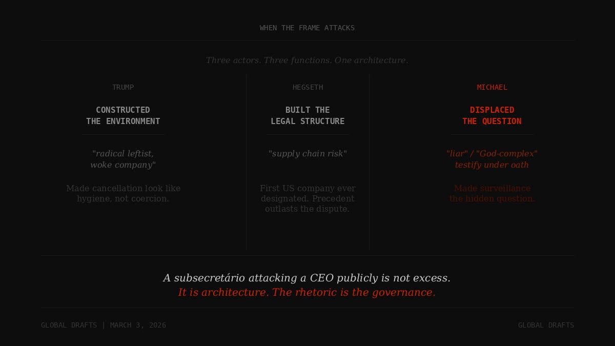 This is what we mean by “frame before weapon.” The frame does not follow the action. It precedes it, shapes it, and then absorbs the recoil. By the time Hegseth’s designation went public, Michael had already been building the interpretive structure that would make the designation legible as hygiene rather than coercion.